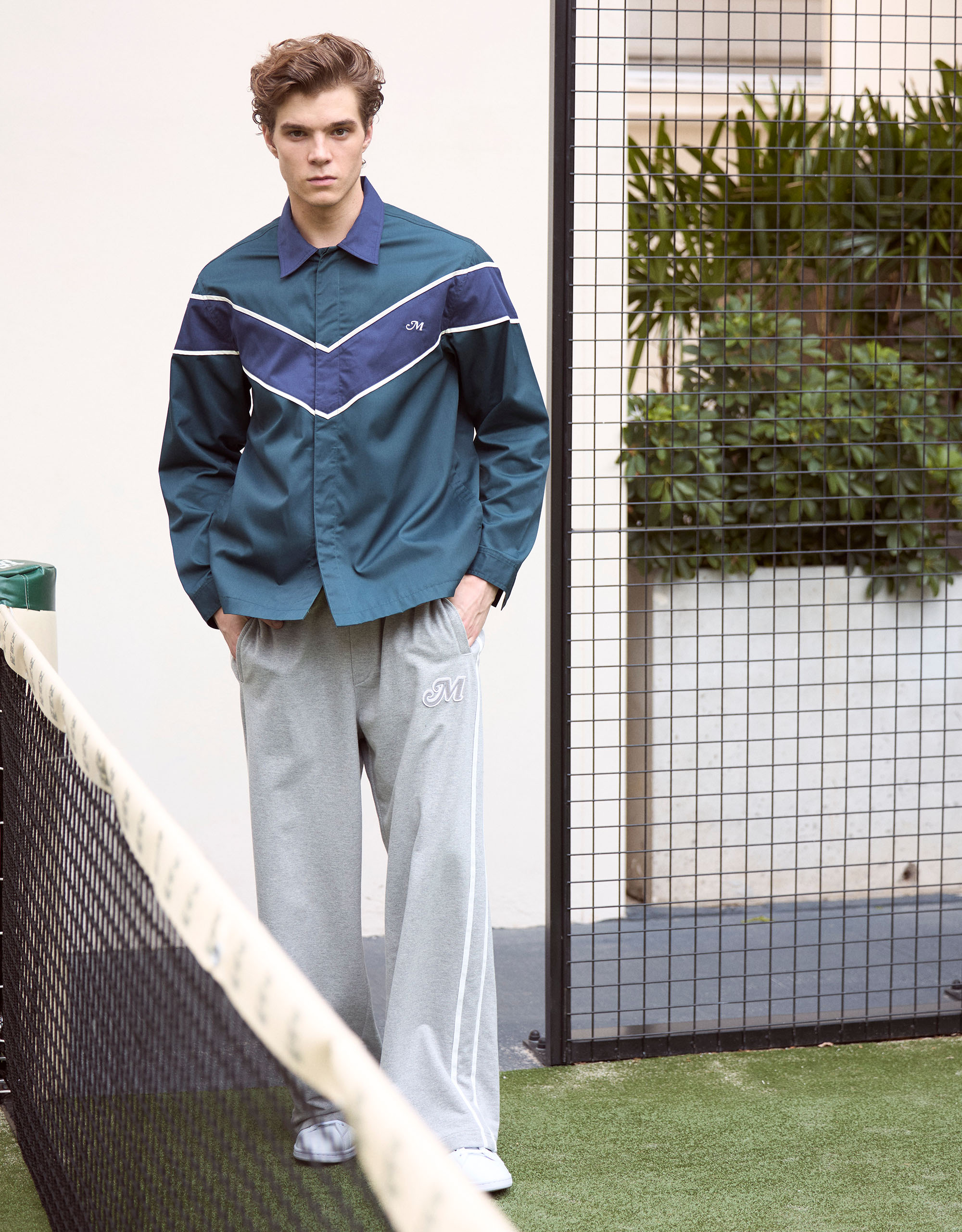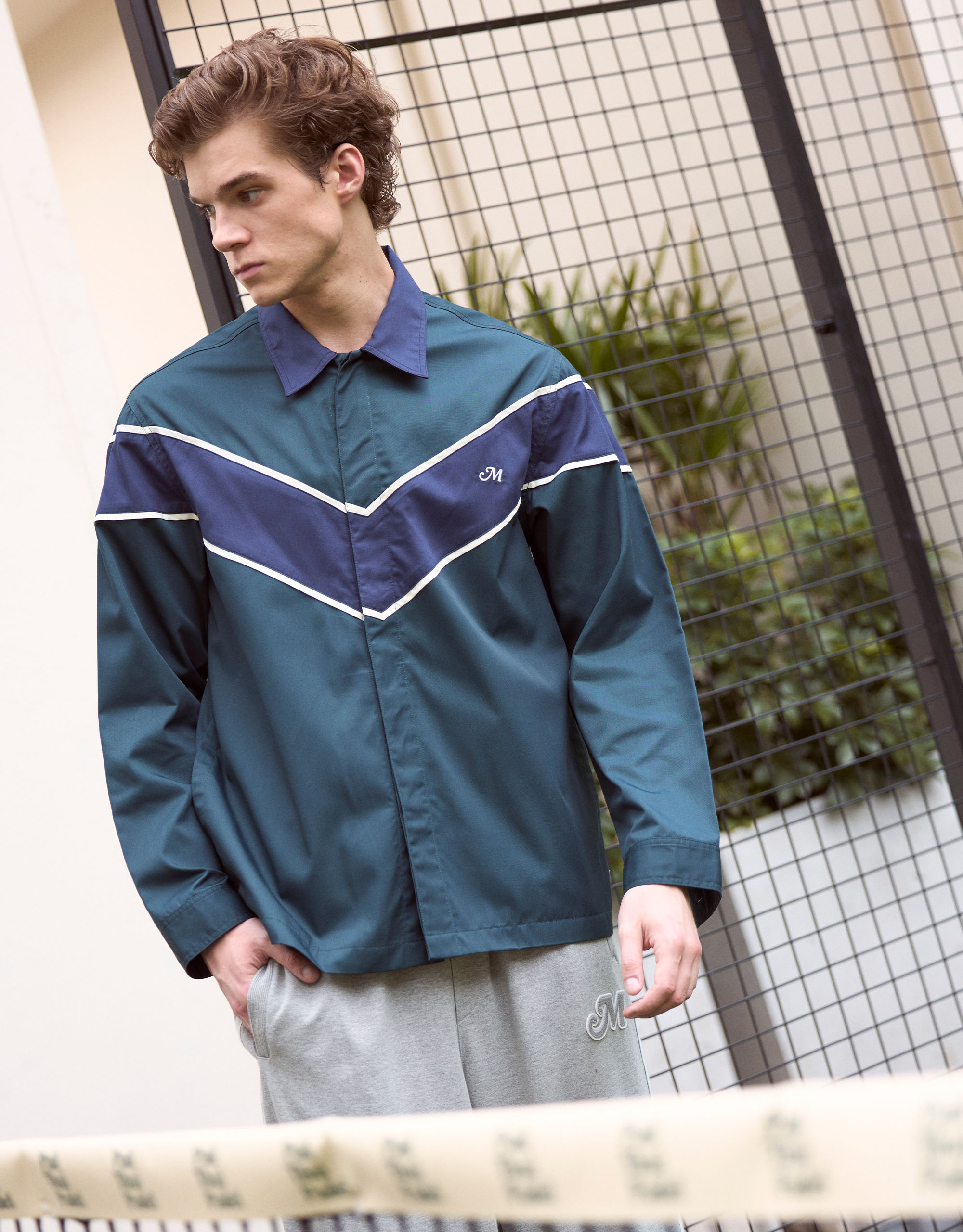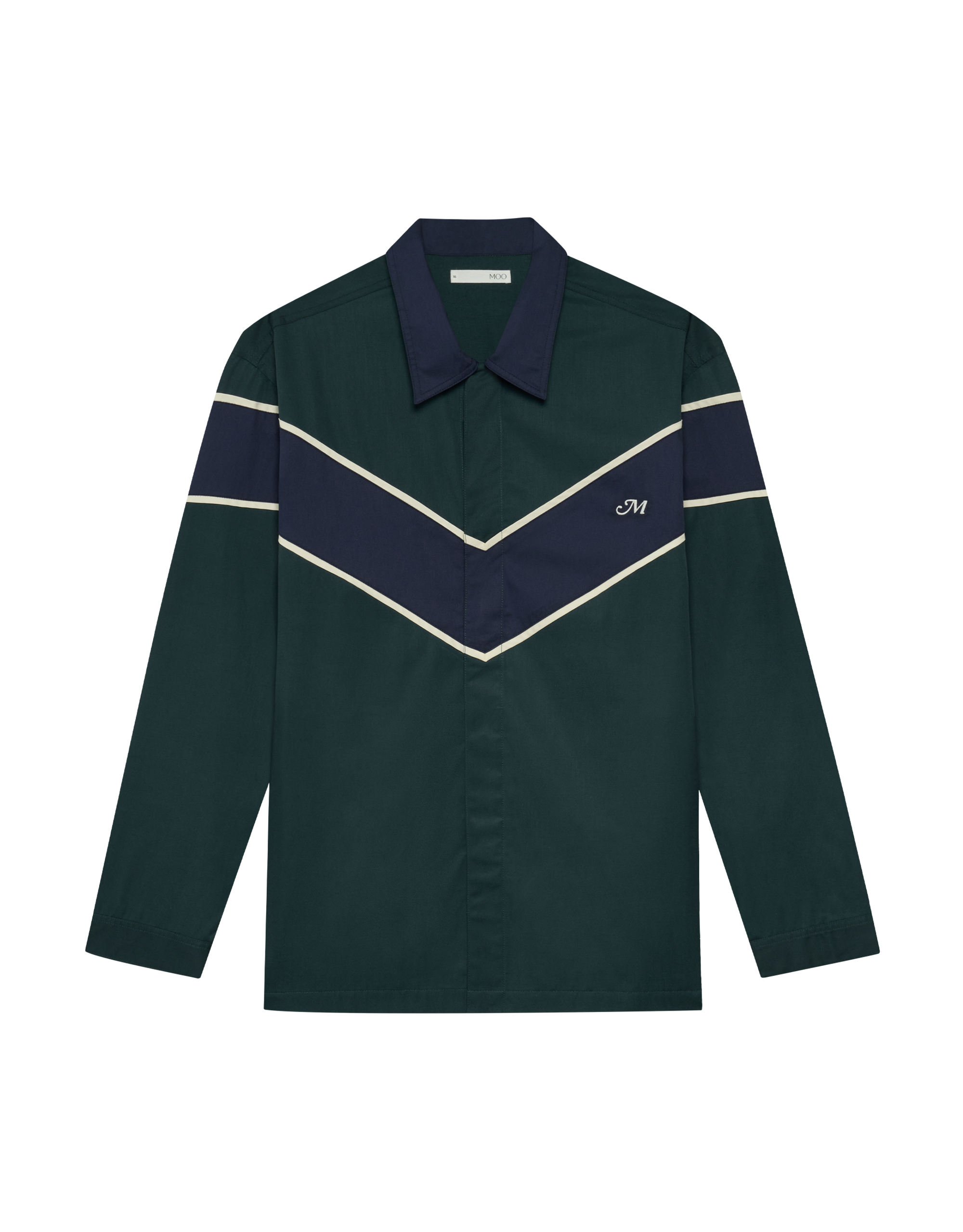 Embroidered “M” at Chest.