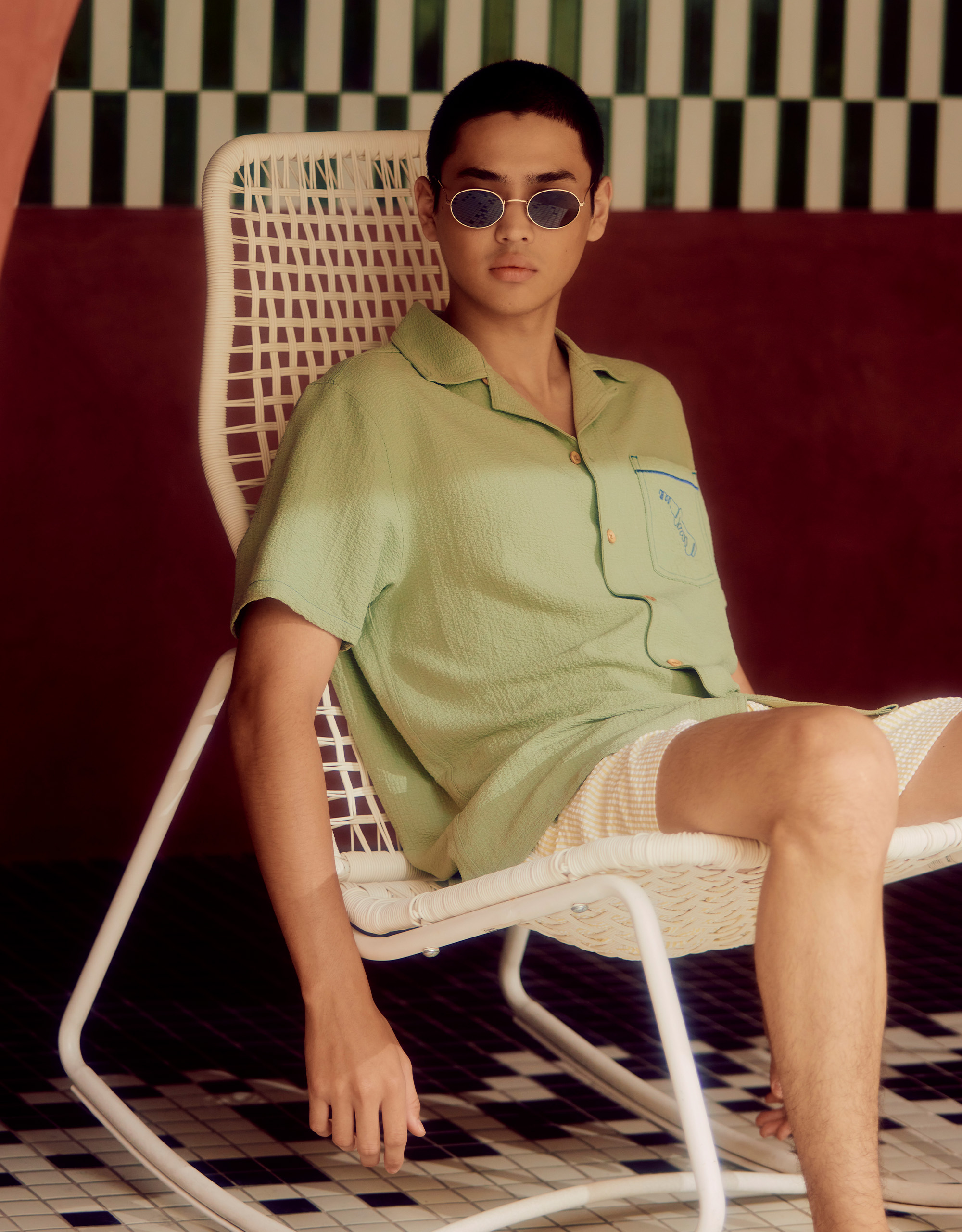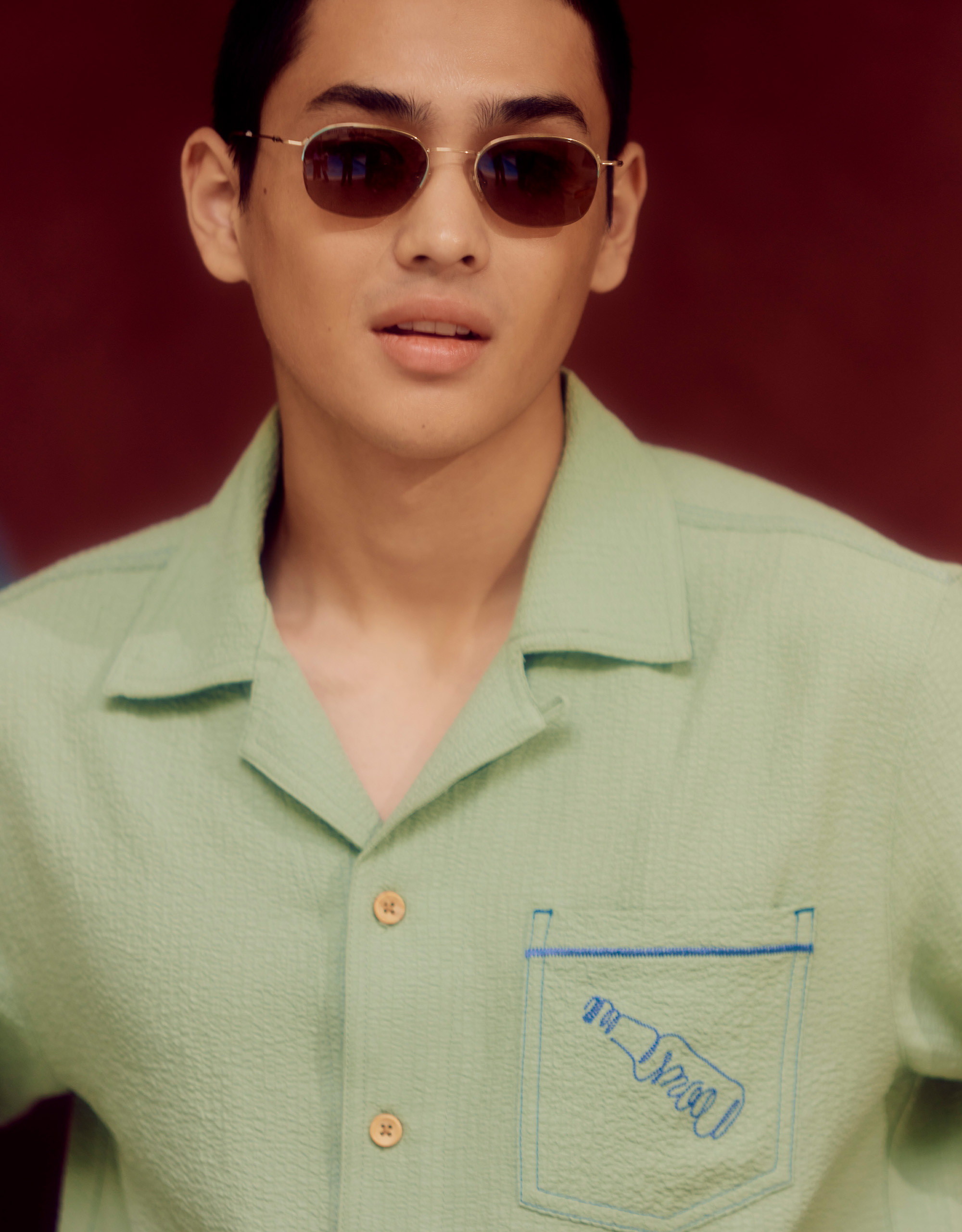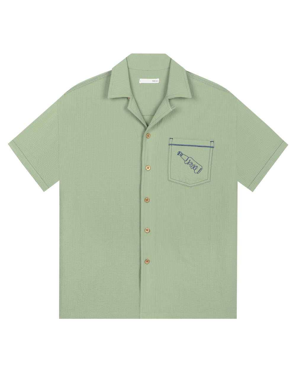 Moo : Super Crunchy Shirt. Short Sleeves. Featuring Contour Drawing Embroidery ‘MOO’ at Chest. Contrast Stitching Detailed. Patch Pocket Detailed at Front. Button Closure at Front.