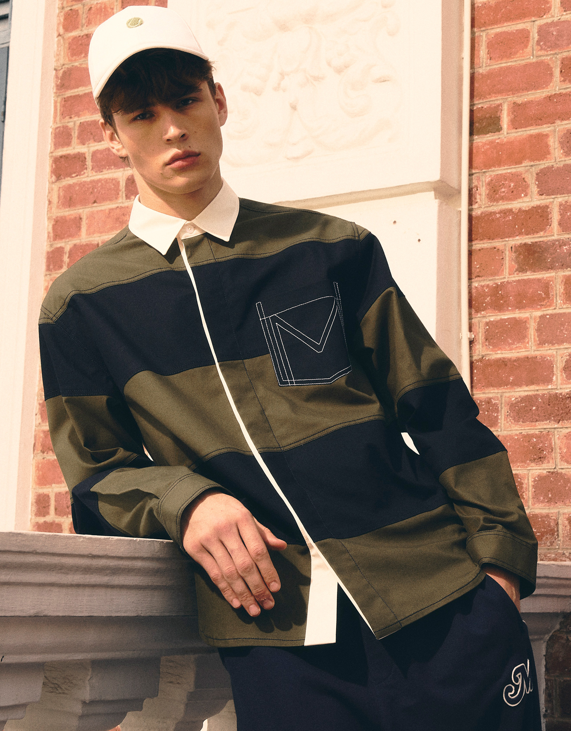 Front Pocket and Embroidered “M” at Chest. Concealed Front Buttons Placket.