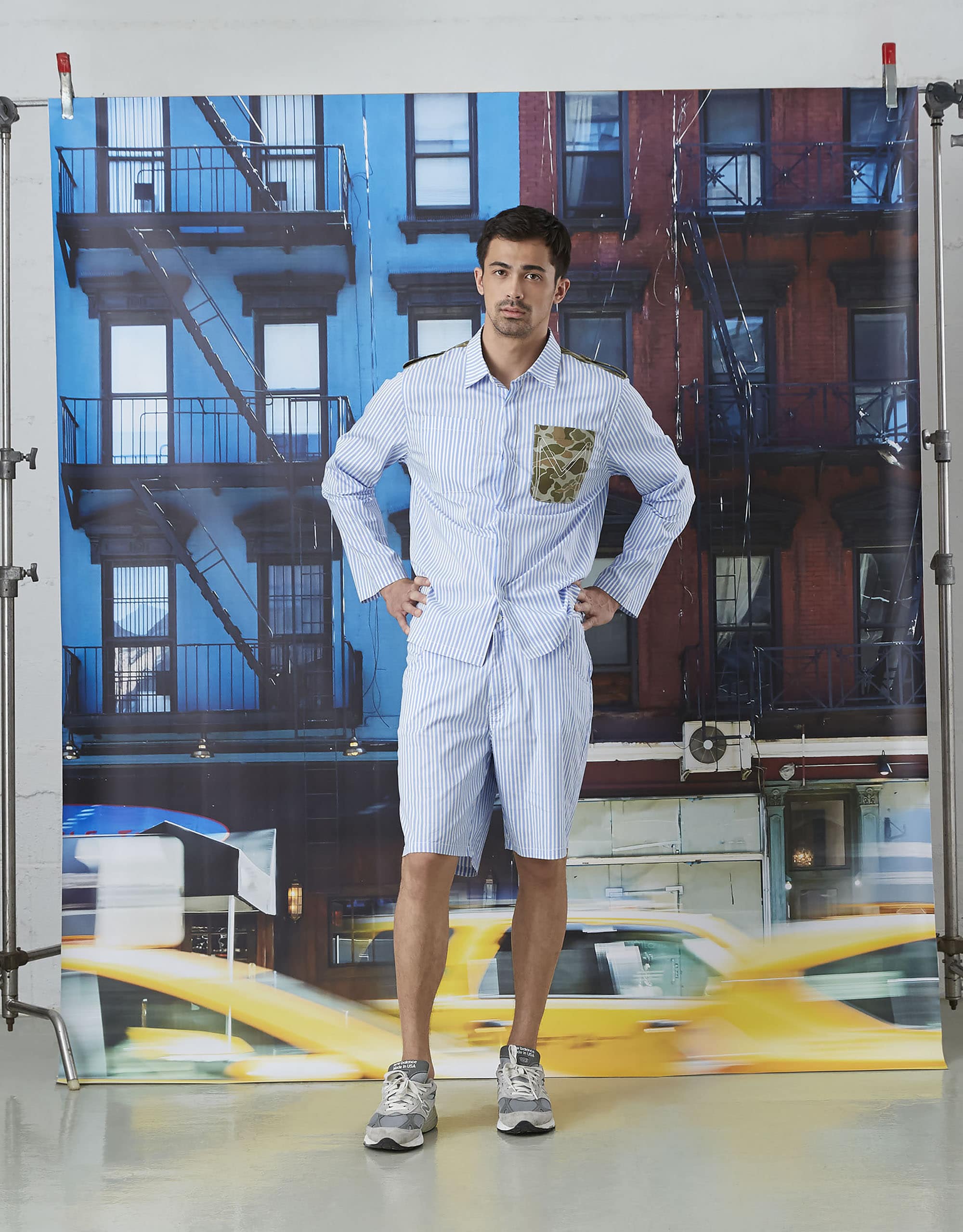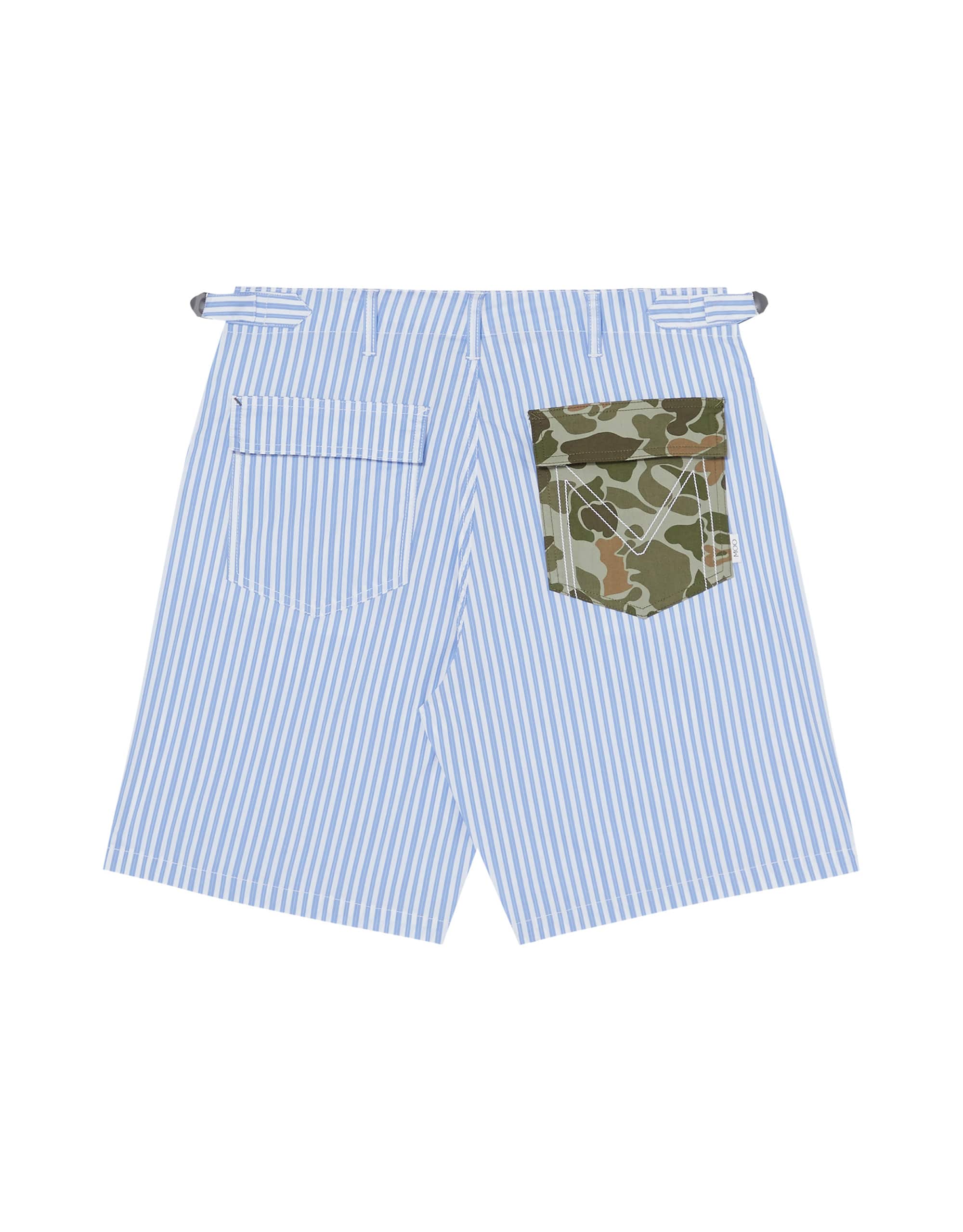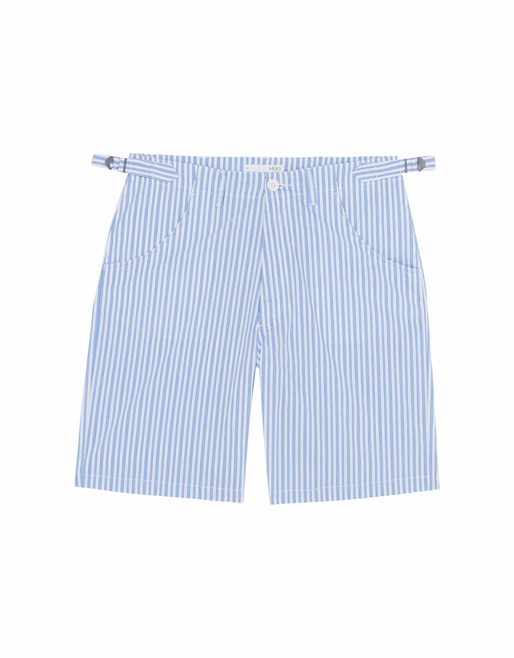 Moo : Cotton Striped Shorts. Side Pockets Styling. Flap Pockets at Side and Back. Waist Adjuster Buckle. Button-fly.