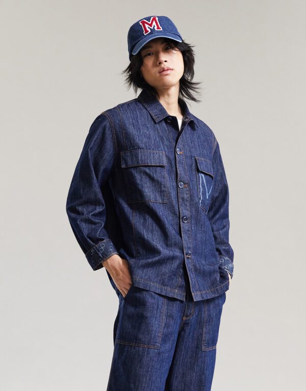 Moo : Washed Denim signature jacket. Featuring hidden burnt out detail at cuffs. Patch Pockets at front with signature M in burnt out detail. Contrast stitching detail. Patch Pockets at front. Single-button Barrel Cuffs.