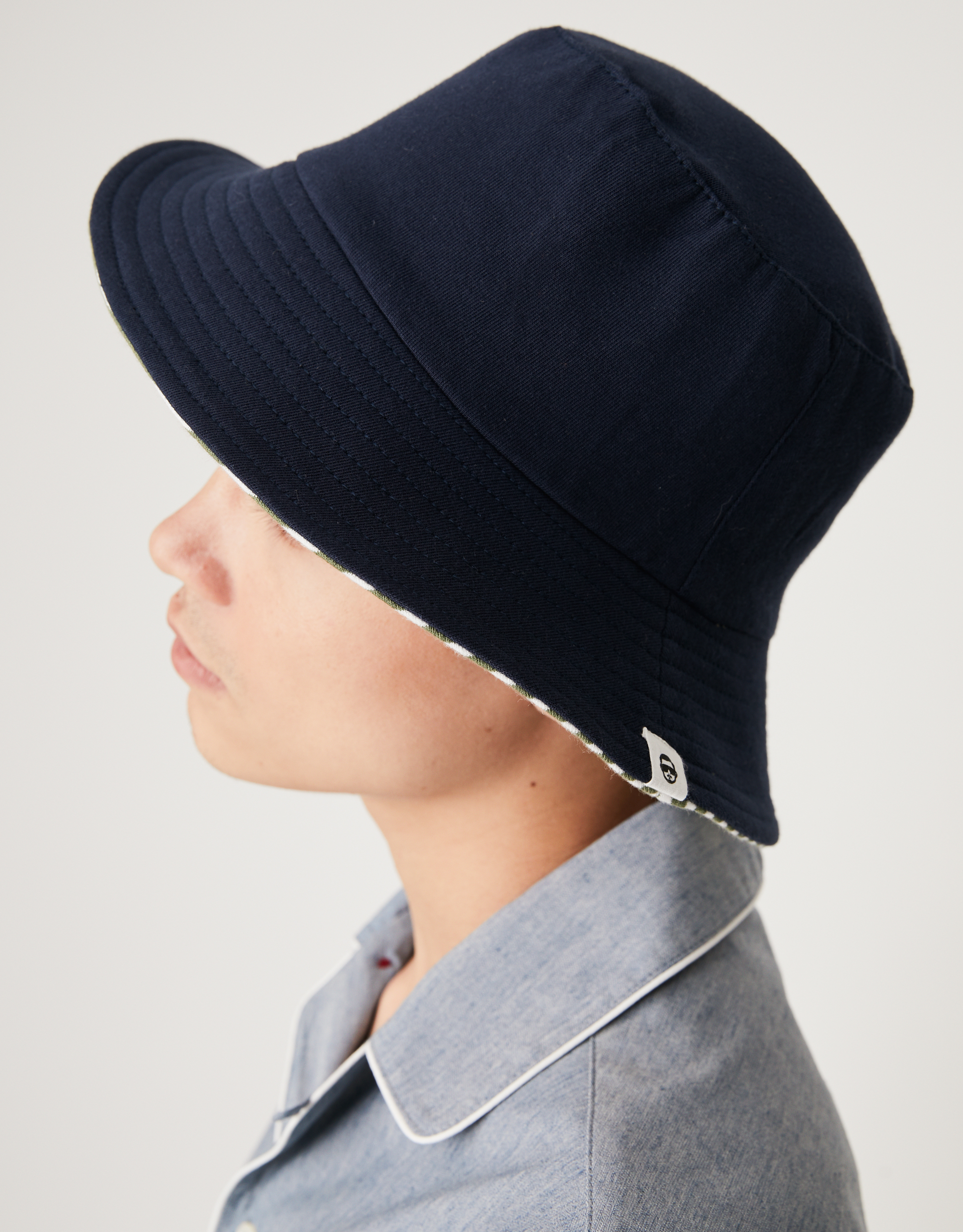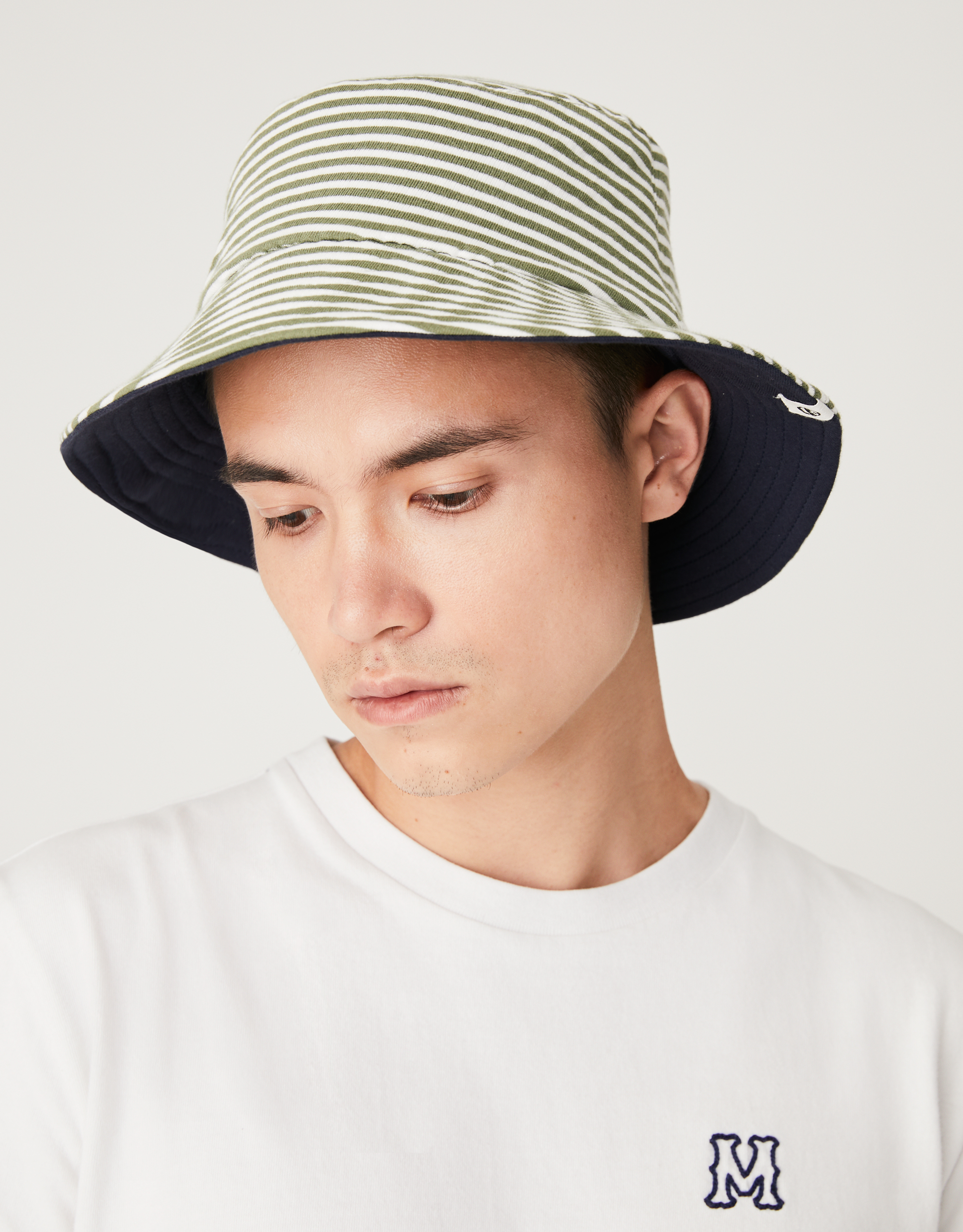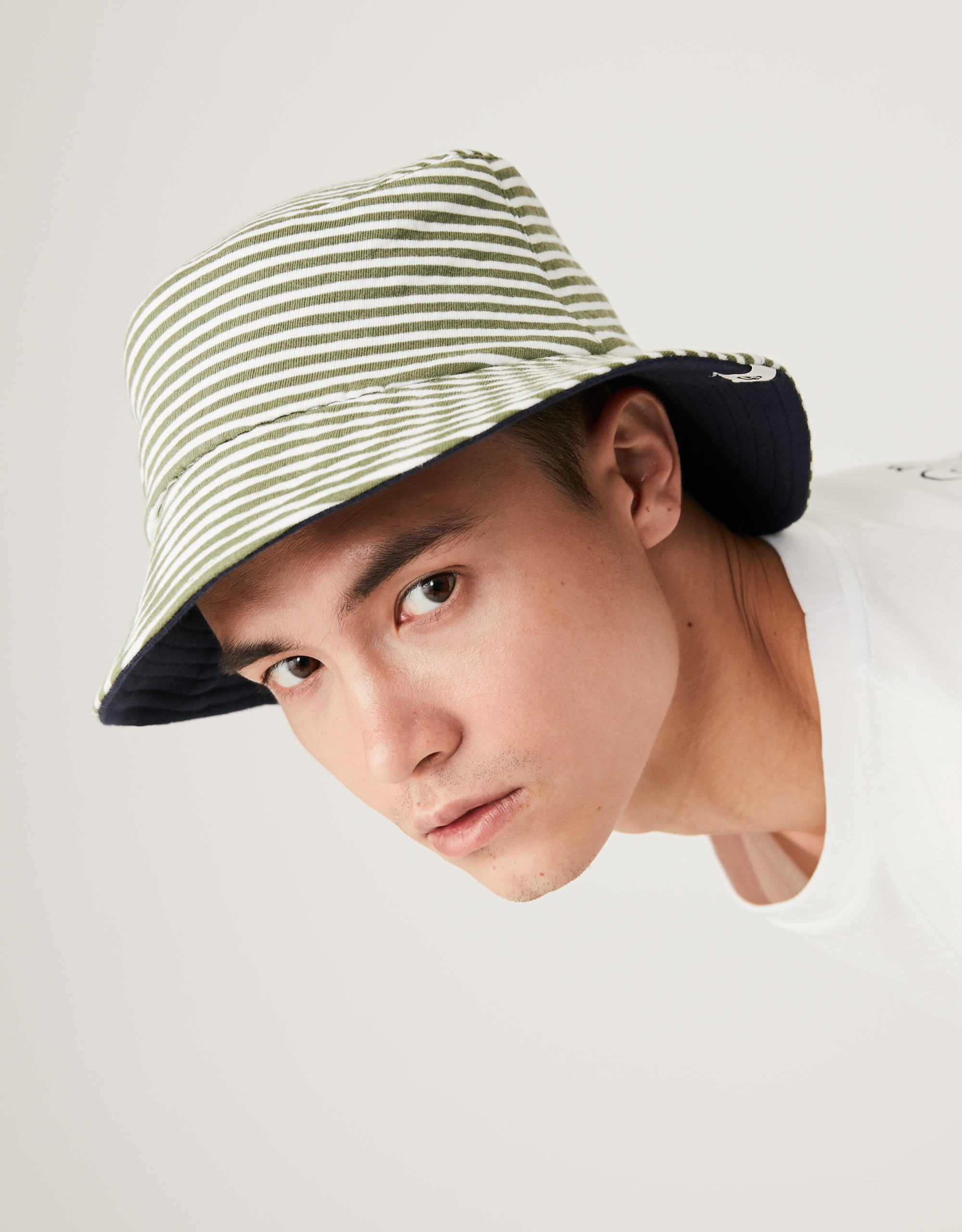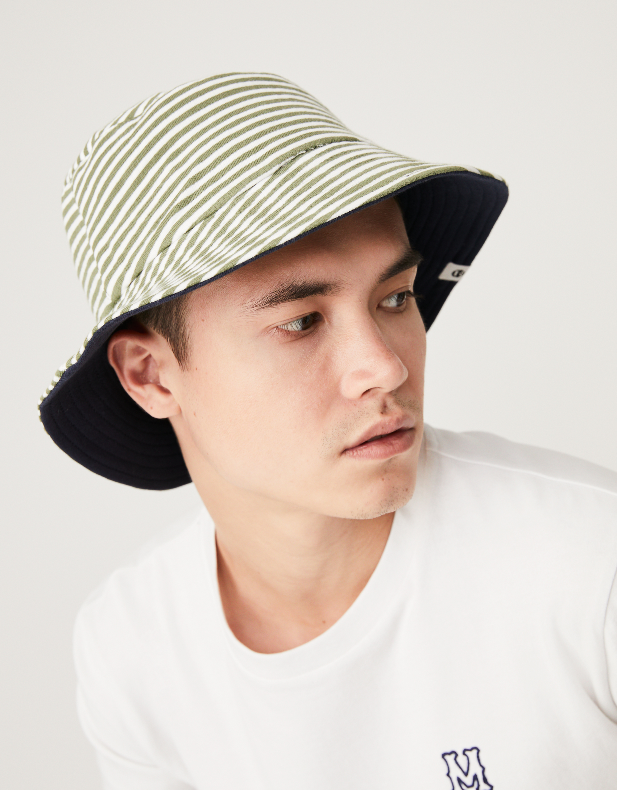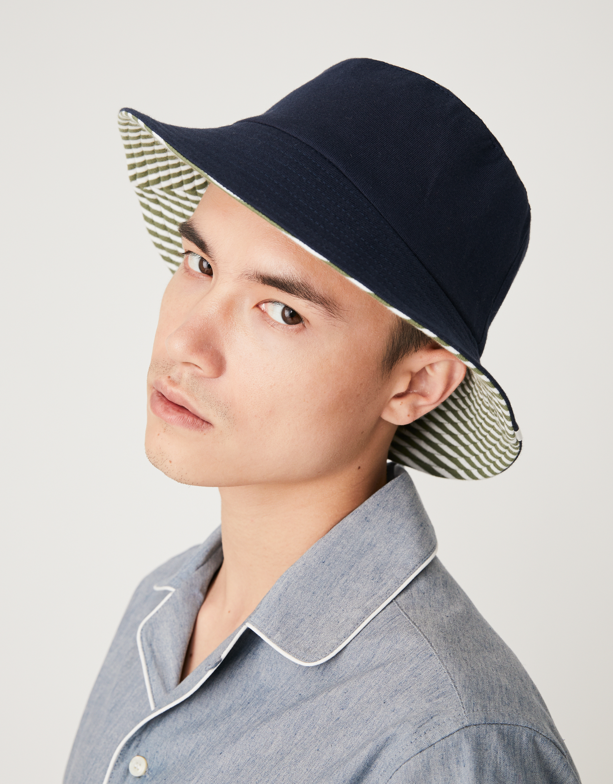 Cotton bucket hat. Two sided wearable: navy plain and olive green stripe.