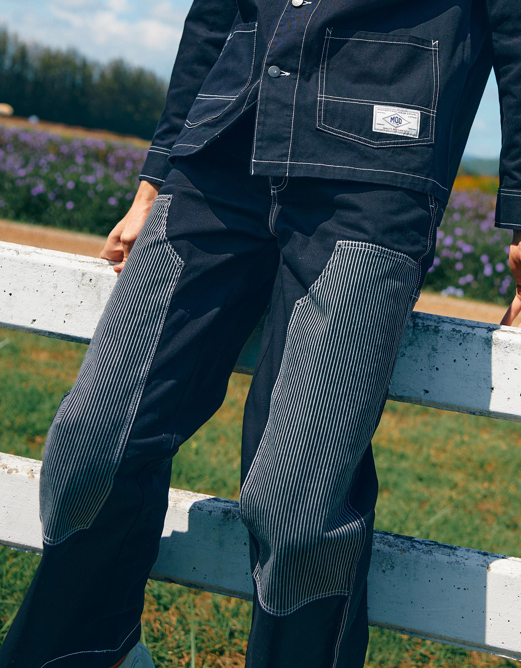- Features with Double Knee Stripes Patchwork Design.
