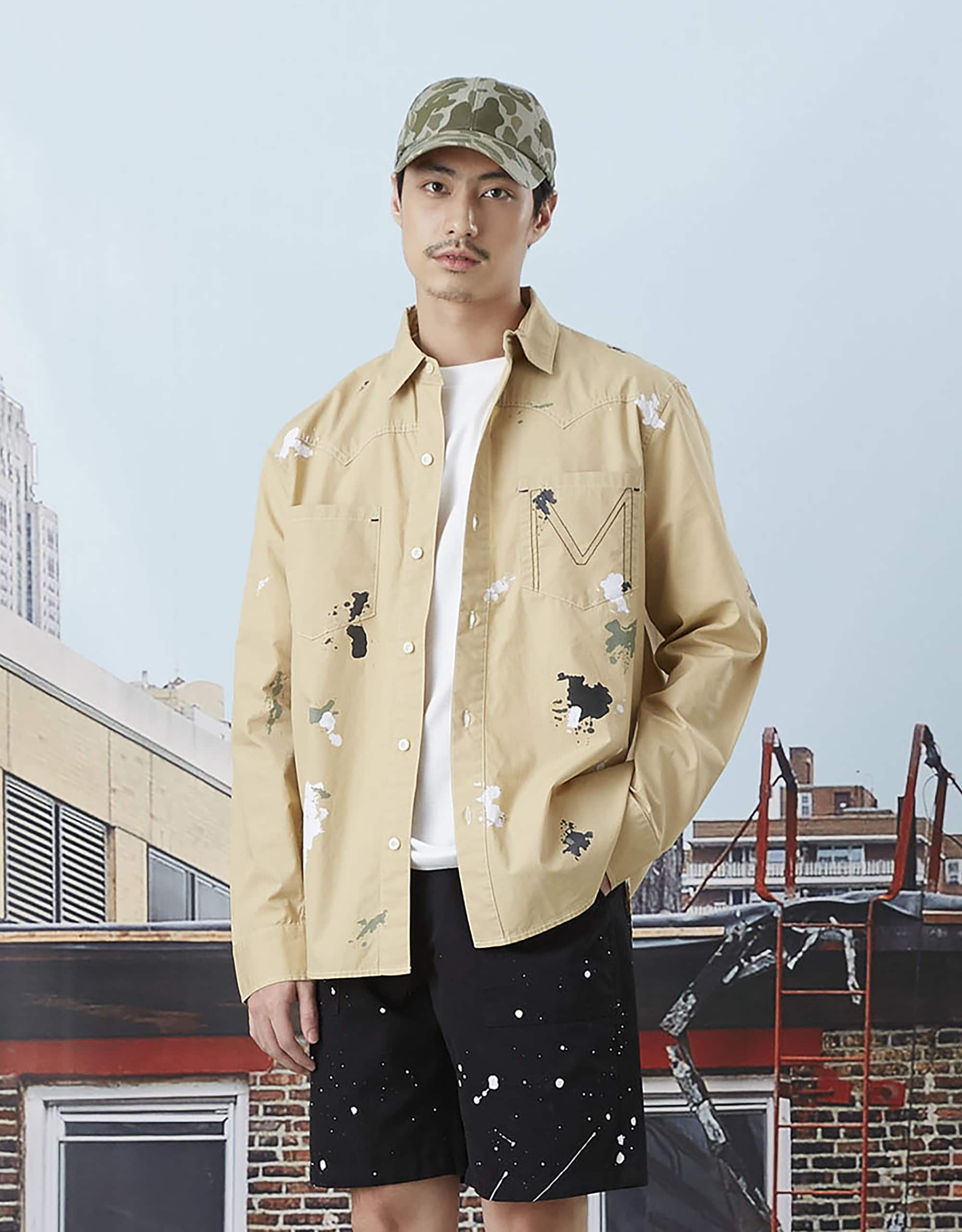 Moo : Long Sleeves Cotton Shirt. Featuring Trio Splash. M Contrast Stitching Patch Pocket Detailed. Button closure at front.